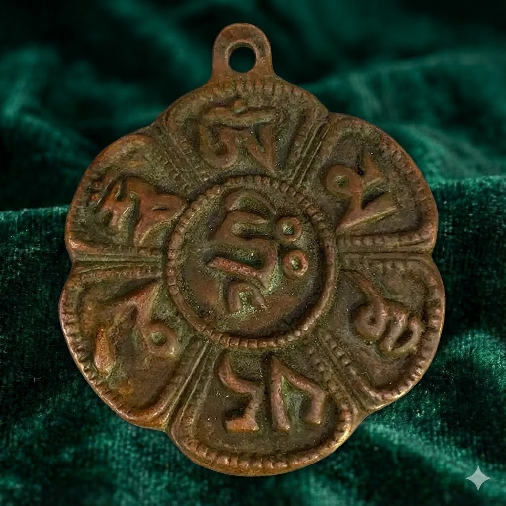 This substantial pendant features the powerful Six Syllable Mantra (Om Mani Padme Hum) intricately relief-sculpted onto an eight-petal lotus design. Crafted from high-quality purple copper (red copper), it boasts a warm, antique patina that gives it the look and feel of a time-honored artifact.